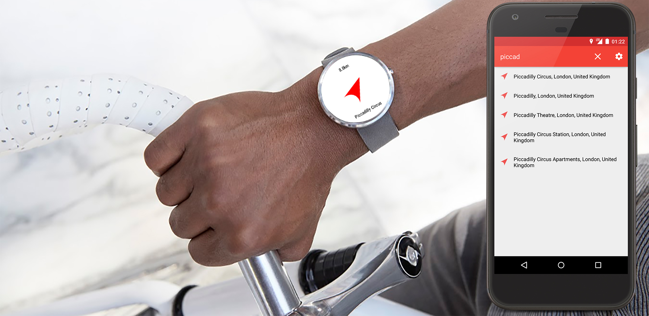 This app is one of my personal projects. It is a compass navigation app for Android Wear smart watches. The user can enter a destination on the phone and then use a smart watch to navigate. A compass points to the destination.
